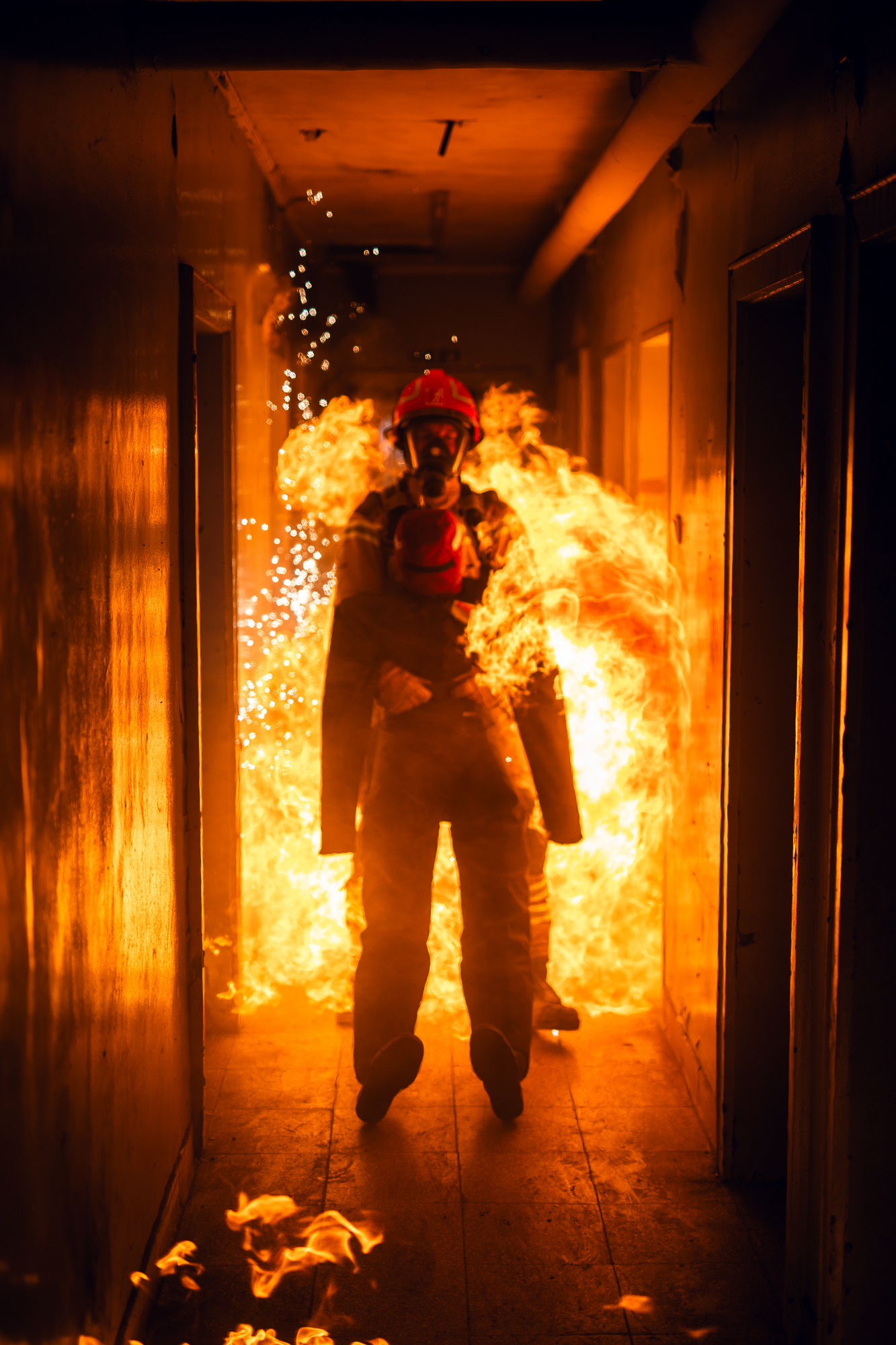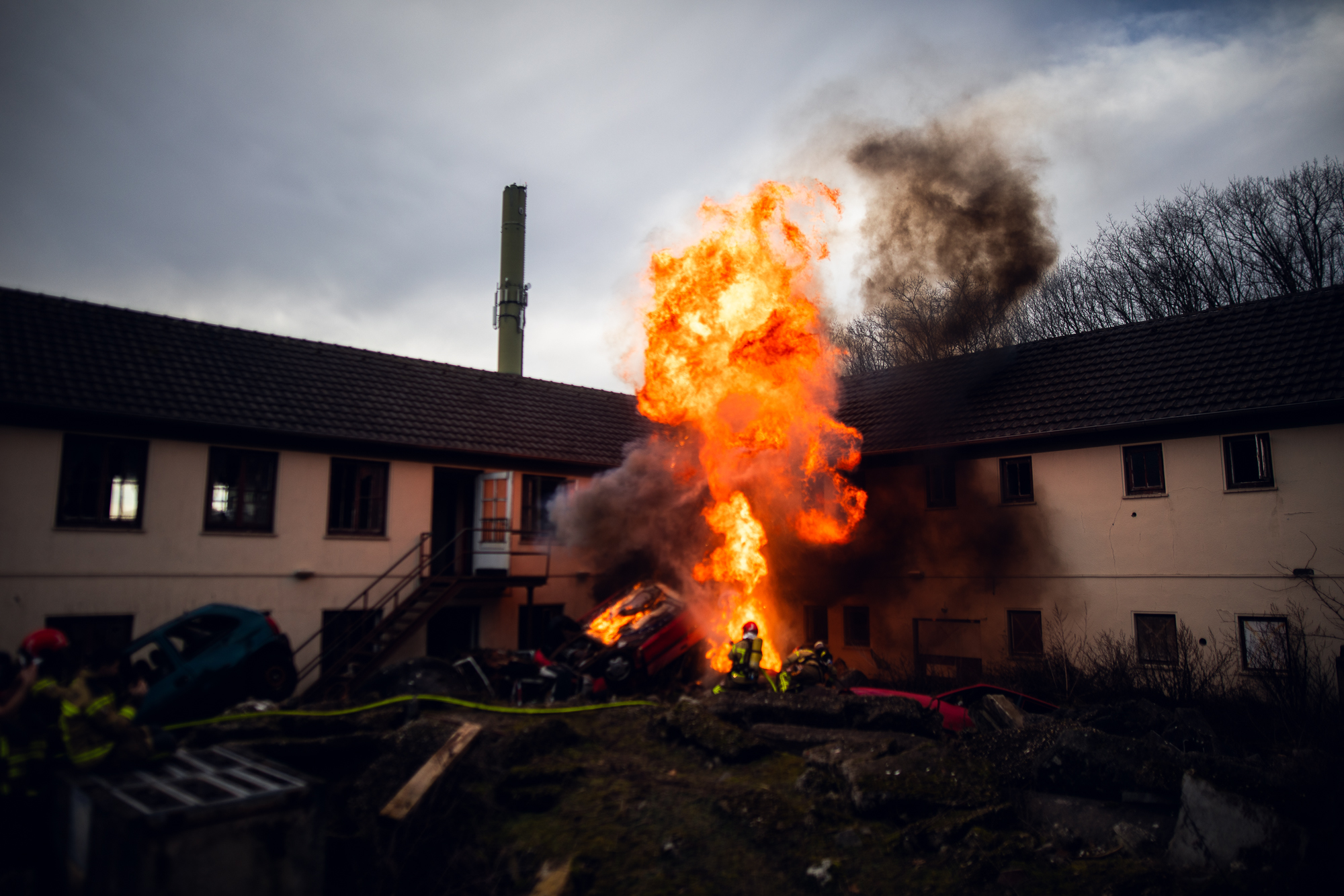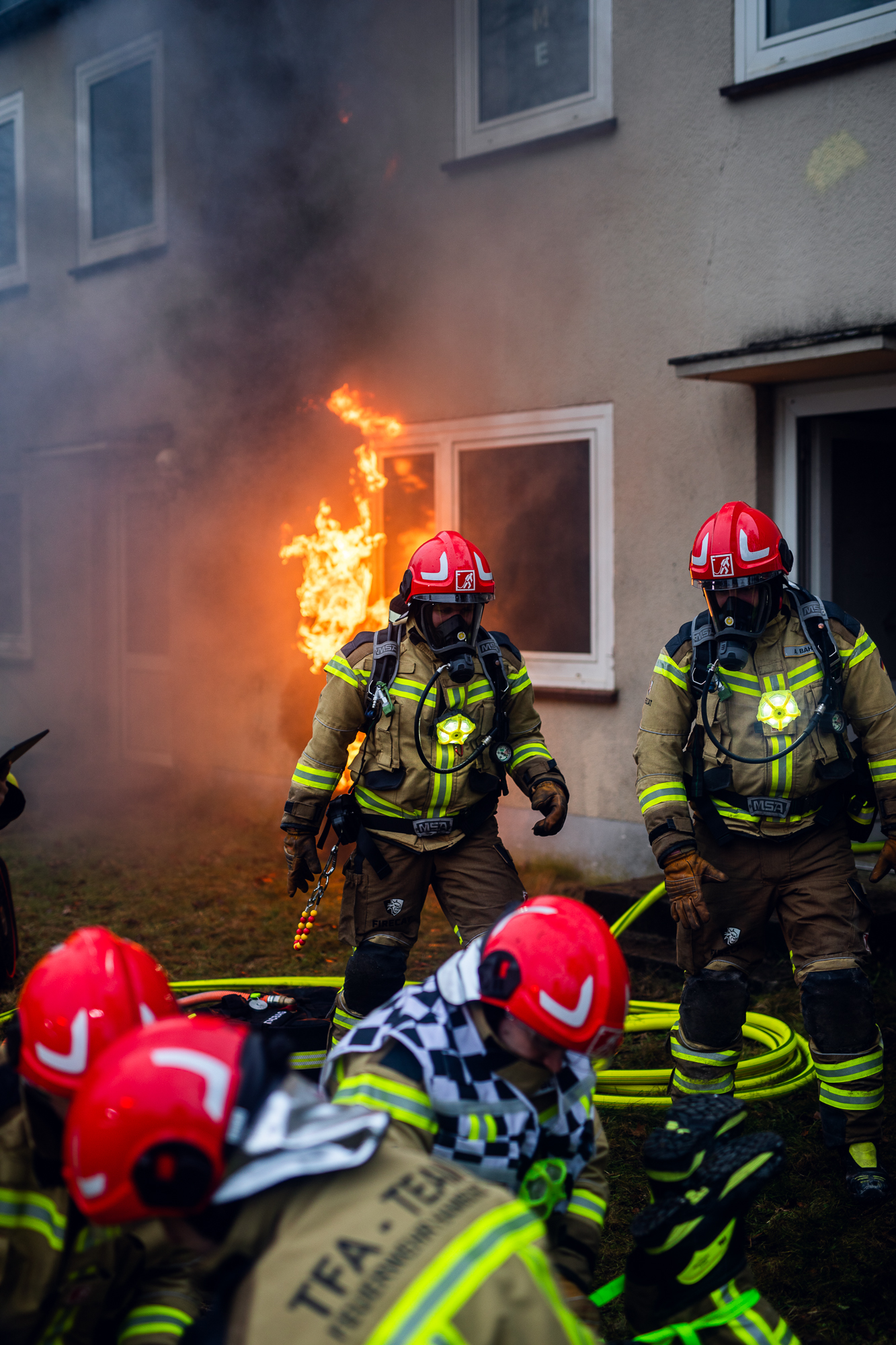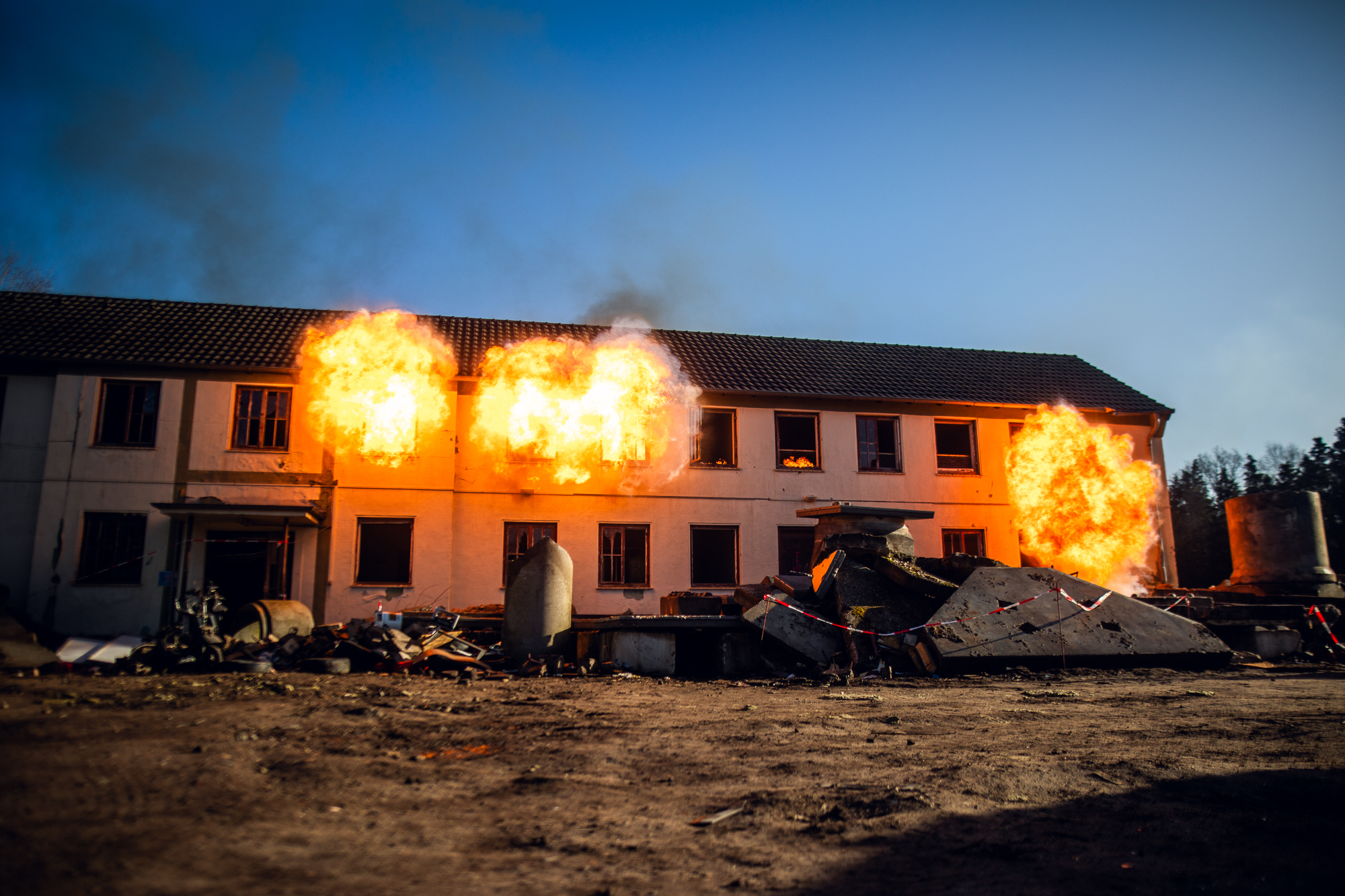 Meine Aufgabe lag dabei in der Umsetzung realistischer pyrotechnischer und feuergefährlicher Effekte. Kontrollierte Flammenbilder, Hitzeeindrücke, Durchzündungen und Explosionseffekte sorgten für authentische Bedingungen – immer mit dem klaren Fokus auf Sicherheit, Wiederholbarkeit und Trainingsrealismus.
